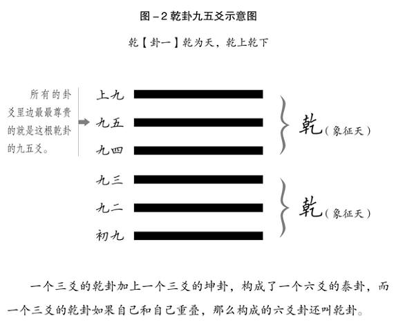 先简单介绍一下什么叫“九五爻”。在六十四卦的系统里,一个卦是由从下到上的六根线条组成的,这些线条叫做“爻”;“九五”的“五”就是指从下往上数的第五根线条;“九”在这里却并不代表数字,而是代表这一爻的属性是“阳”。所以,所谓“乾卦的九五爻”就是指乾卦的第五根线条,它的属性是阳性。