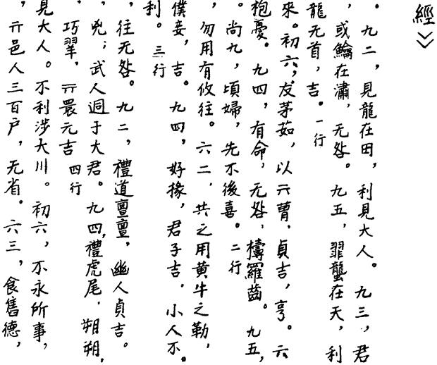 我们先要分清楚,从“乾:元,亨,利,贞”到“用九:见群龙无首,吉”,这是《易经》部分,后面的《彖》、《象》、《文言》那么长的大段落都属于《易传》。