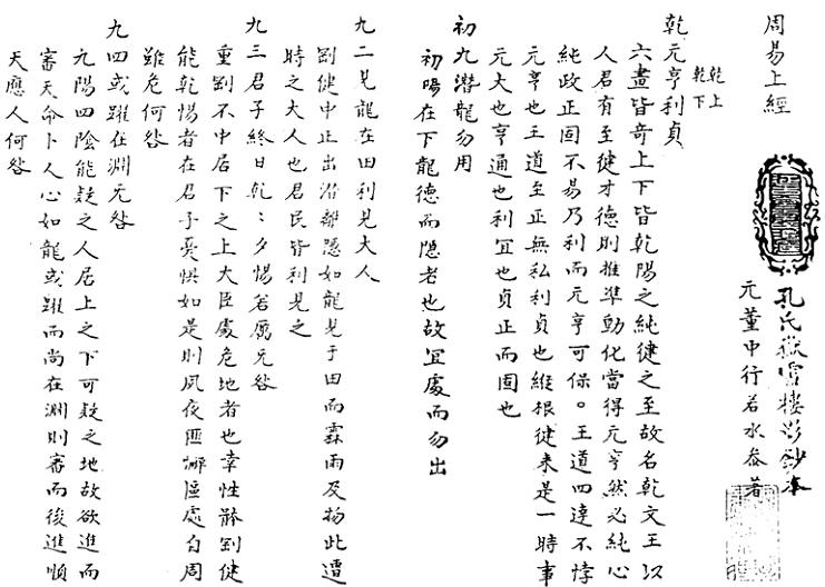 《周易》乾、坤两卦之下的文字比其他各卦都多,也正说明了这两卦的重要。乾卦内容如下: