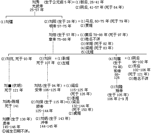 光武帝死后,各派继续在各级官僚机构中斗争,而都只能暂时取得胜利。在此期间,大朋党的历史成了外戚及其同伙的历史的同义语。[66] 皇后的立和废完全是出于政治动机,虽然史料宁愿从个人的角度来进行解释。