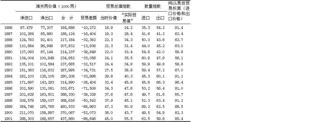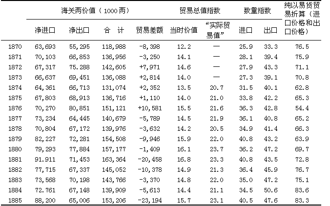 按当时的海关两计算,总贸易量从1870年到1911年增至七倍多。如上所述,银的价值夸大了贸易的实际增长:按贸易量计算,在这四十年中进口增至312%,出口增至307%。贸易的总增长率以当时的价值计算,在十九世纪九十年代前是比较慢的,而在二十世纪第一个十年增加得最快。数量指数表明进口的增长相当稳定(1905—1906年的猛增是日俄战争的直接结果,不应把这两年当作典型),而出口在十九世纪九十年代比较呆滞,但在清朝最后几年迅速增加。出口猛增的原因是主要从满洲输出了大豆和豆制品。如果把1888年前的贸易数据加以调整,进口以成本、保险和运费之值计算,出口以离岸价格之值计算,并且把鸦片和其他商品从香港“走私”入境的情况考虑在内,1870—1887年中国的对外贸易很可能出超。1888—1900年,进口有限地超过了出口,每年平均入超40,876,000海关两。1900年以后入超大大增加,1901—1911年每年平均达121,377,000海关两。一部分逆差被华侨的侨汇所弥补,到1900年为止还被少量净出口的金银所弥补。其余部分则被流入的资本所弥补,这部分资本包括上述1895年以后的工业投资和下面将要讨论的清政府借的债款。