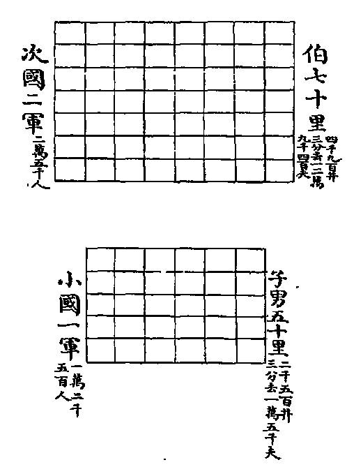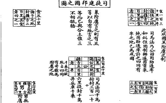 《周礼 大司徒》:"凡建邦国,以土圭正其地而制其域。诸公之地,封疆方五百里,其食者半。诸侯之地,封疆方四百里,其食者半参之一。诸伯之地,封疆方三百里,其食者参之一。诸子之地,封疆方二百里,其食者四之一。诸男之地,封疆方百里,其食者四之一。"《职方氏》:"凡邦国,千里封公,以方五百里则四公,方四百里则六侯,方三百里则十一伯,方二百里则二十五子,方百里则百男,以周知天下。"