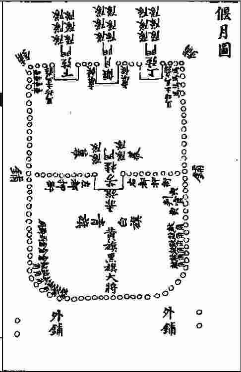 背山岗,面坡泽,前后险阻,其地狭窄之营也。凡偃月外营,以四六分,幕一万人,以六千人守地九千六百尺,积得前一千六百步,积得四里,馀一百六十步为营。转以六千四百尺,得步一千六十六步四尺为弦。弦置三门,相去三里五十步一尺五寸。营内有地一十五顷八十五亩五十八步四尺。右置上弦门,中偃月门,左下弦门。偃月中营,营以二千五百人守地四千尺,积得六百六十步馀四尺,积步得一里,馀三百步四尺。每幕加地四尺五寸四分。每幕营中两厢置土马一十二匹,大小如常马,被其鞍。令士卒披甲胄,橐弓矢,佩刀剑,持矛盾,左右上下,以便习事。