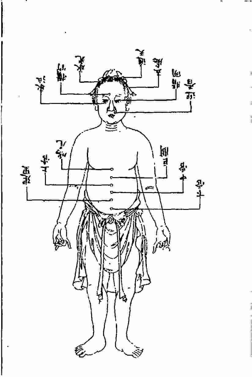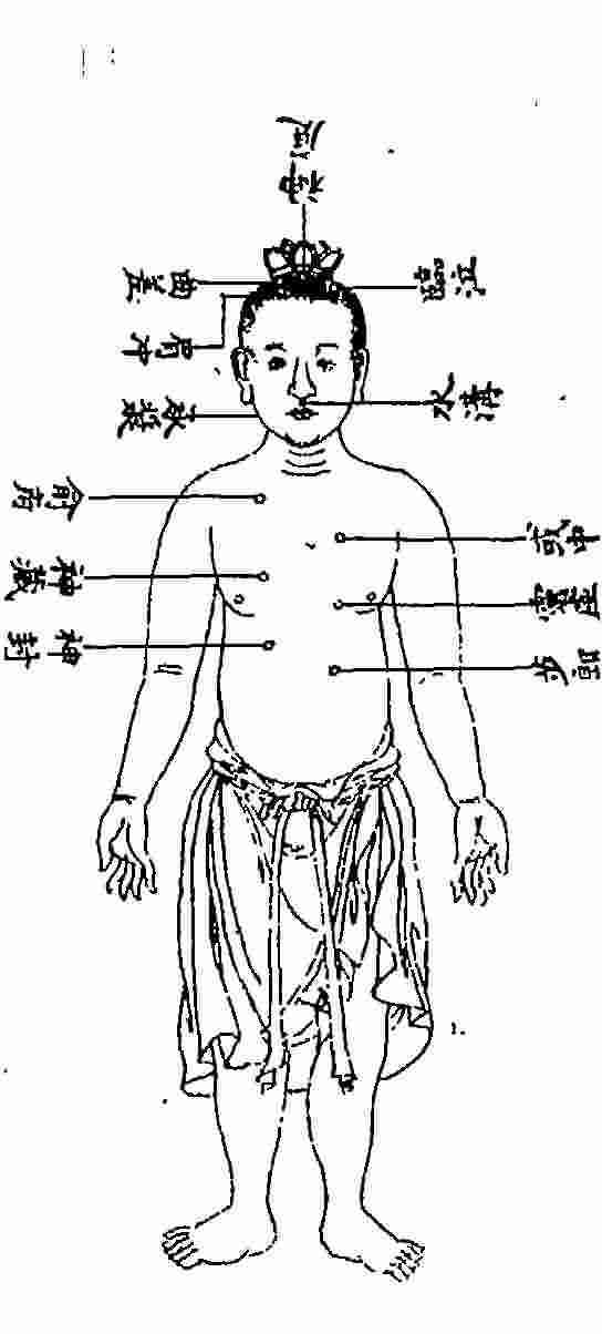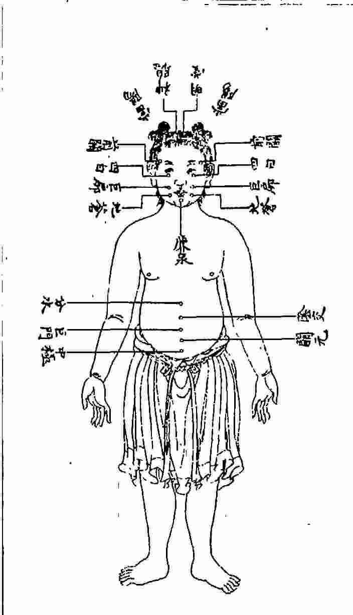 神庭一穴,在髪際直鼻上督脉,上一寸髪際是也。足太陽、陽明之會。主治腫氣,風癎、顛風不識人、羊鳴、角弓反張、披髪而上歌下哭、多學人言語,驚悸不得安寢。禁不可針。日灸七壯至百壯。若針,即發於其病在舉火之時(按:似有缺、誤)。忌猪、羊、魚肉、酒、麵、熱食。