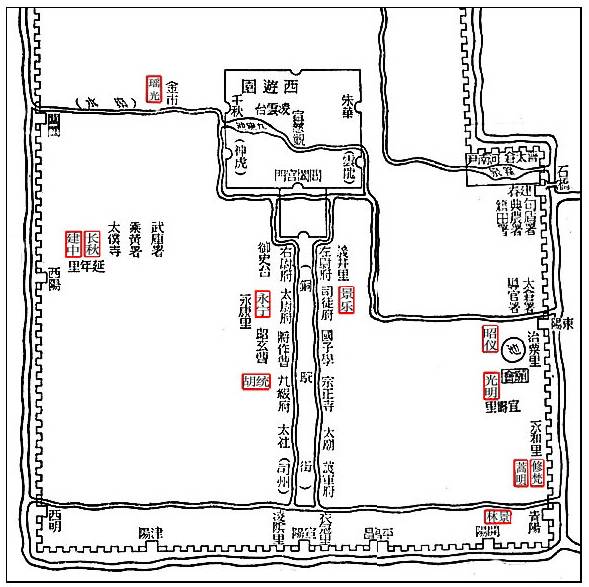 阊阖门前御道东,有左卫府。府南有司徒府。司徒府南有国子学堂,内有孔丘像,颜渊问仁、子路问政在侧。国子南有宗正寺,寺南有太庙,庙南有护军府,府南有衣冠里。御道西有右卫府,府南有太尉府,府南有将作曹,曹南有九级府,府南有太社,社南有凌阴里,即四朝时藏冰处也。