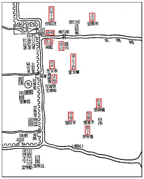 建阳里东有绥民里,里内有洛阳县,临渠水。县门外有洛阳令杨机清德碑。