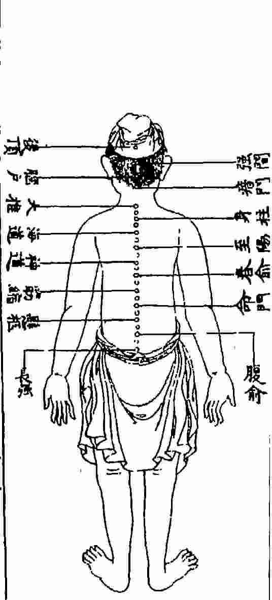 脊俞一穴,一名“神宗”,一名“脊中”。在第十一椎中中央。督脉氣所發。治風、癎、癲,邪温病,積聚,下利。忌灸。針入五分。